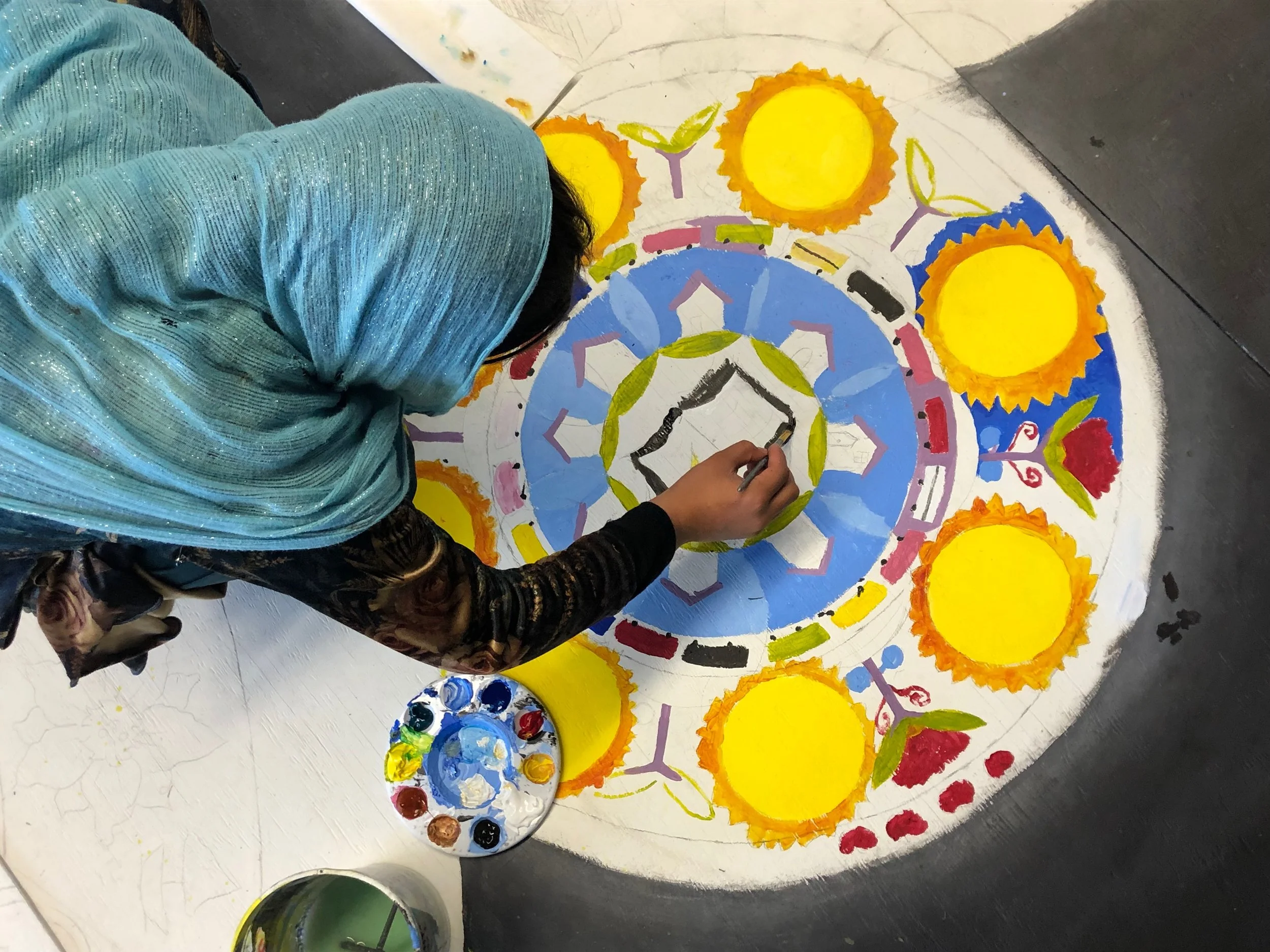 Those who stayed at Camp Atterbury have now found homes throughout North America. Based on the participation of 59 evacuees, this mural remains as a record of their collective experiences and hopes for the future. It also stands as a memorial for the brave people who sacrificed their lives in attempt to bring peace to this country. The exhibition of this mural will rally support for those left behind, suffering under constant threat of the Taliban.